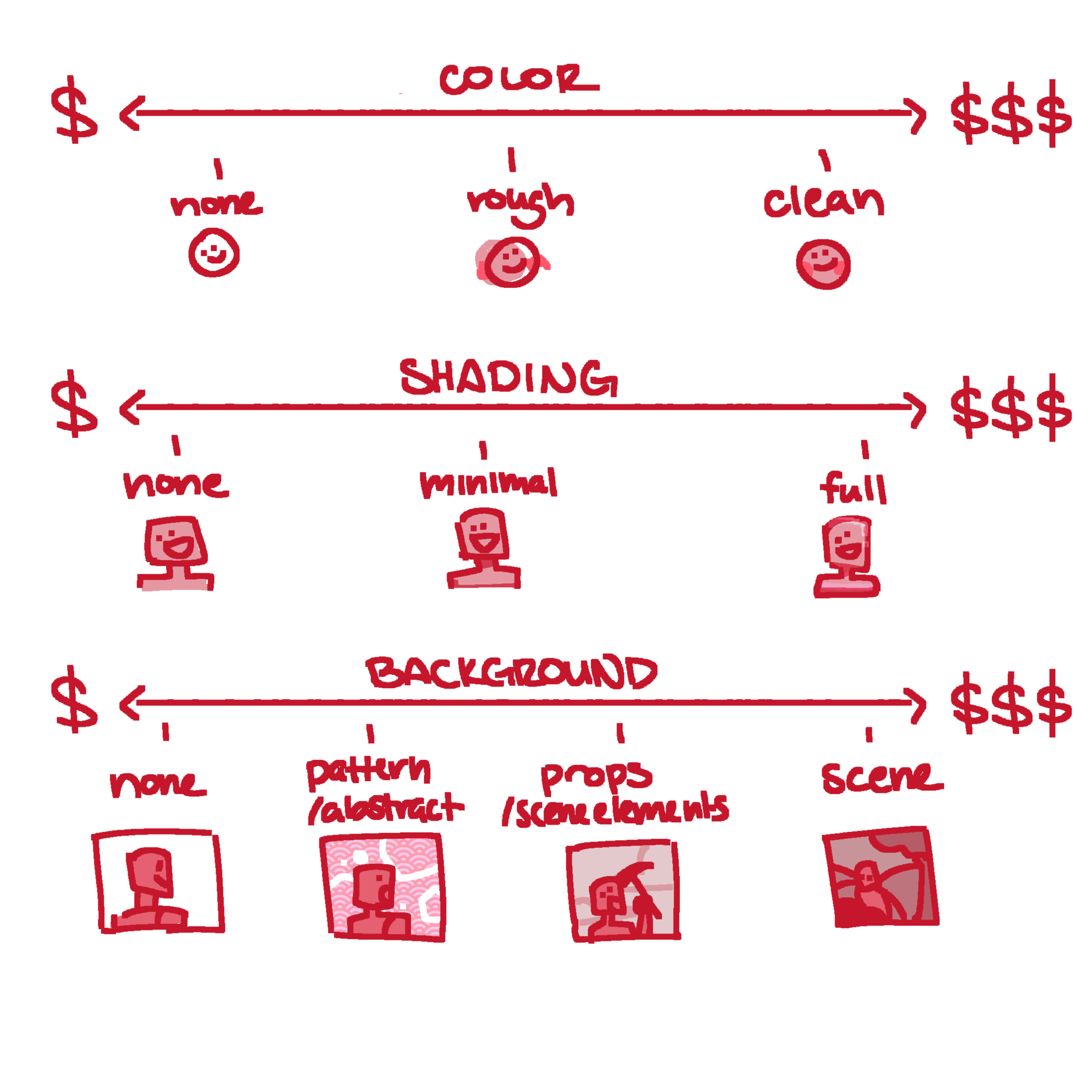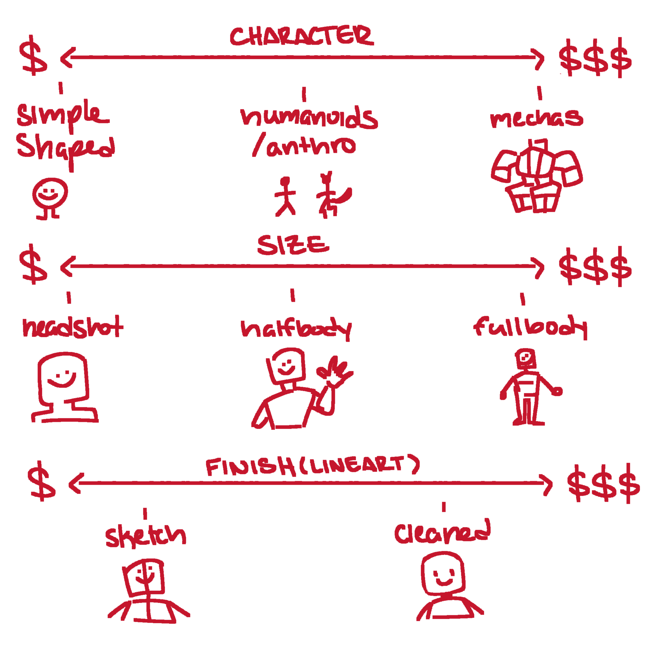 ‣ Prices vary heavily on complexity (more characters, complex character designs, etc.)‣ Usually, I will provide a sketch and then we negotiate more about pricing, but how I calculate is below